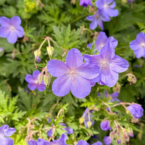 A striking formal pond with stepping stones and water blades adds a sense of calm and structure. Pleached trees provide privacy and seclusion, while the planting blends existing mature specimens with a new soft, romantic scheme of purples, blues, pinks, and whites.